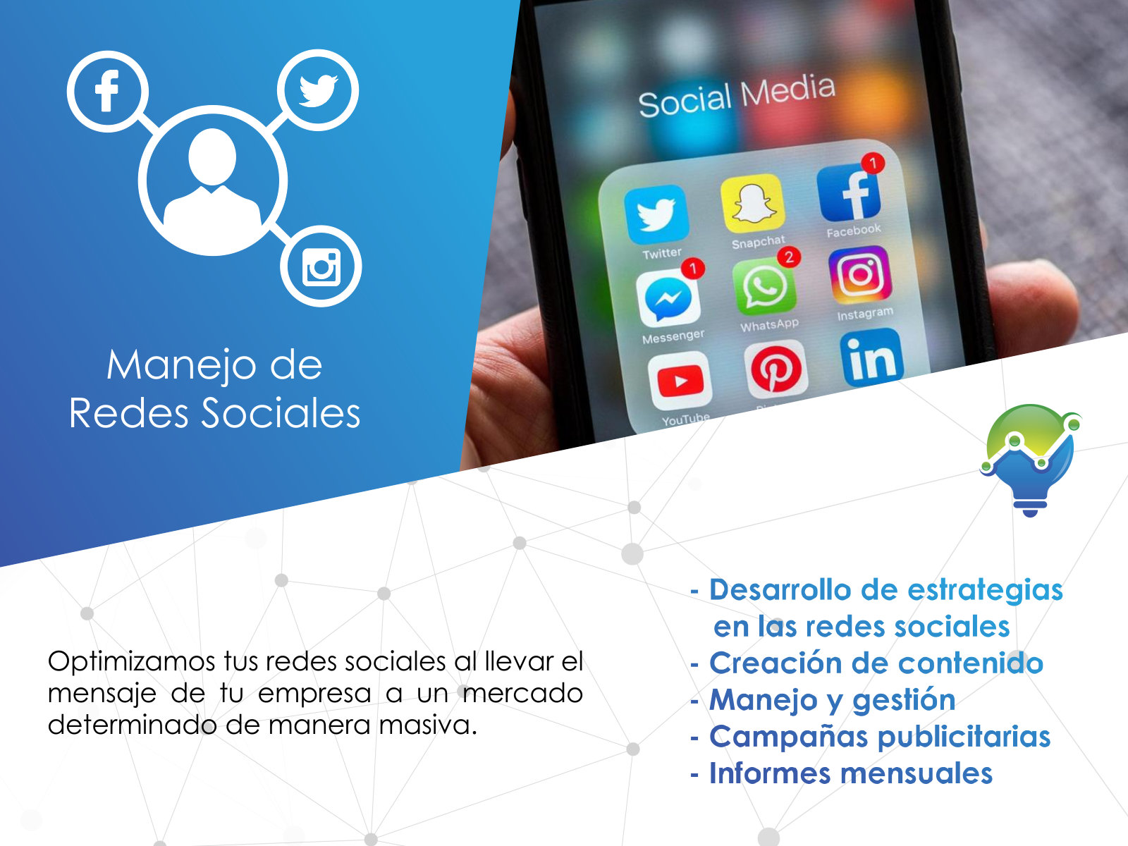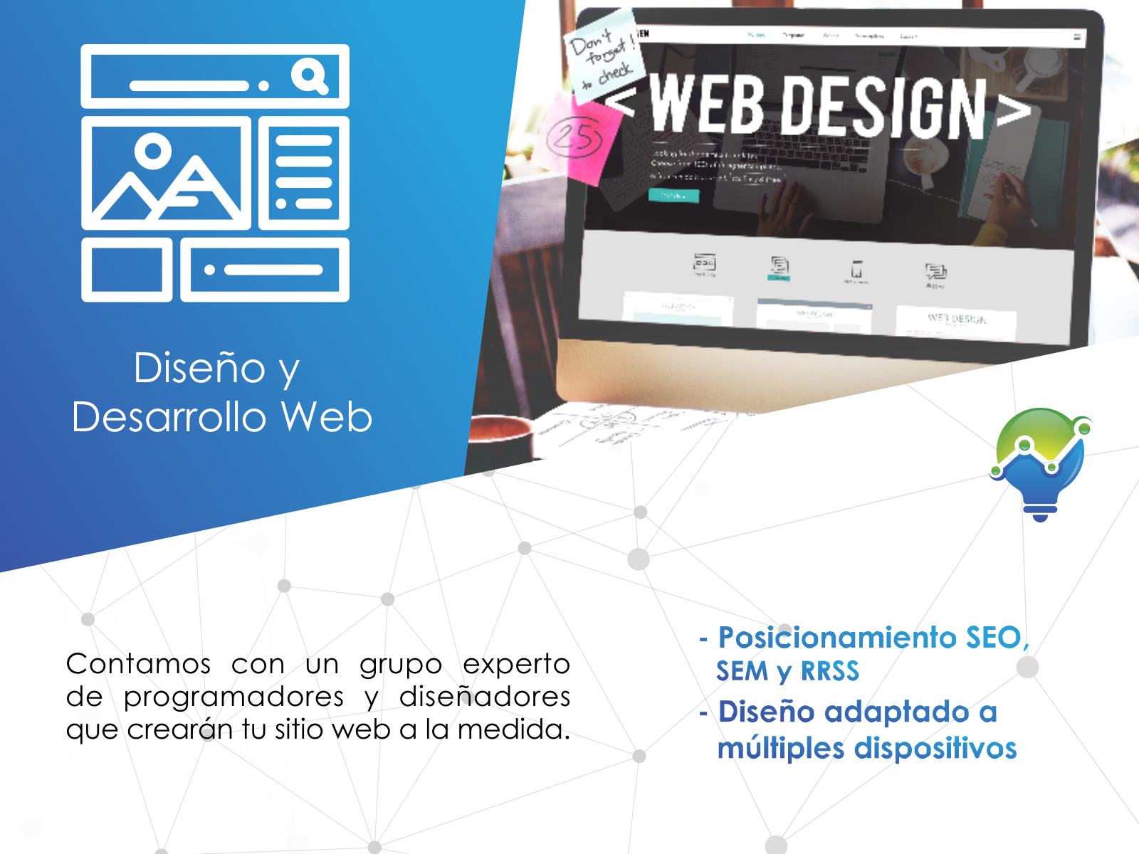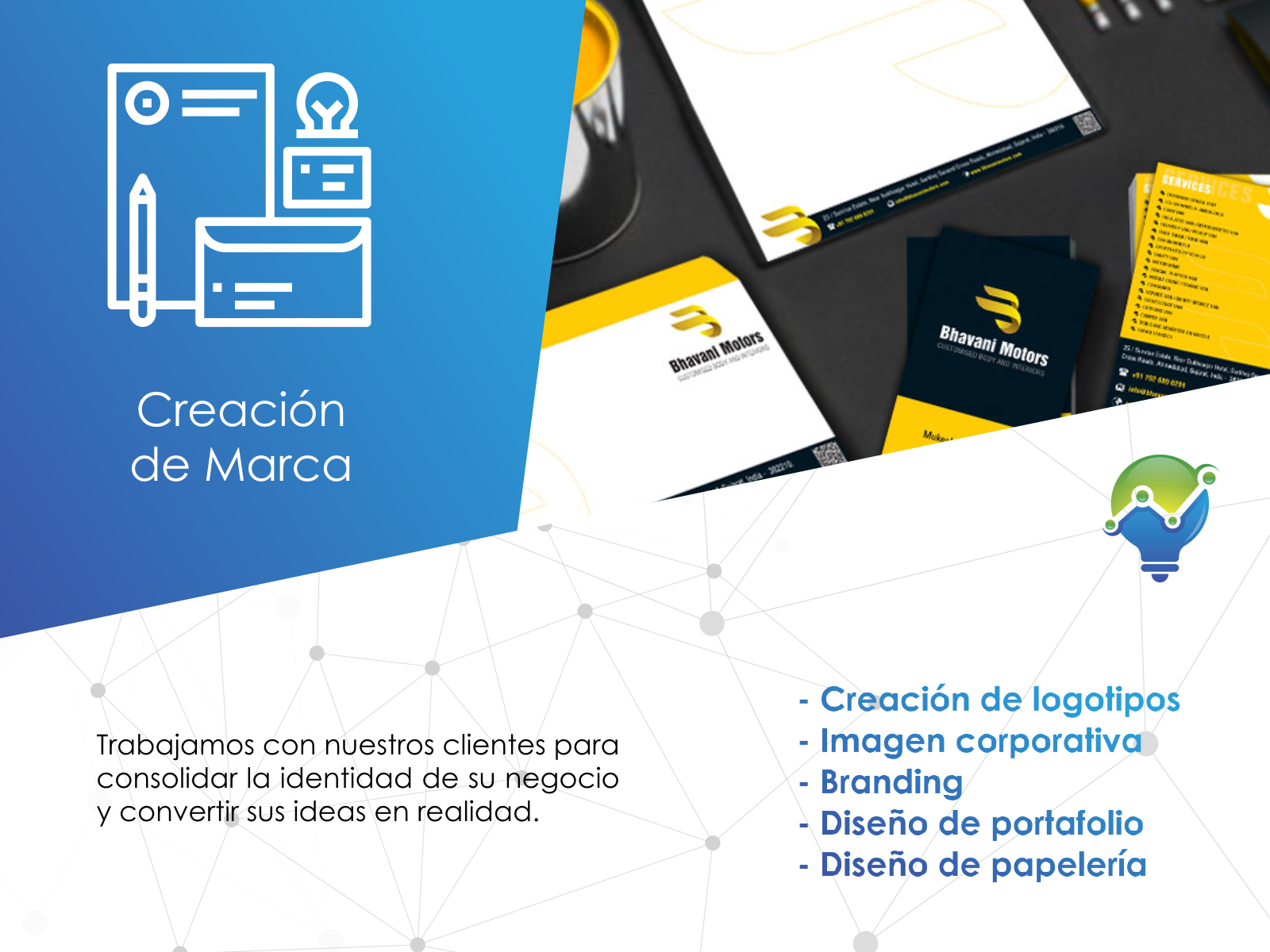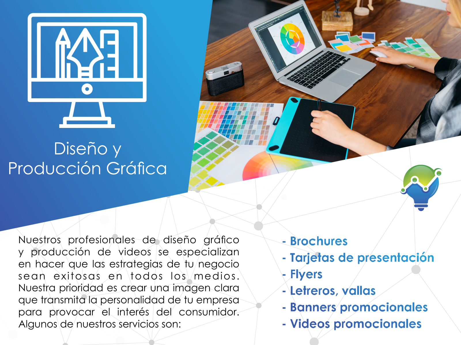 Hacemos brillar y sobresalir tu negocio a través de nuestros productos y servicios. Contamos con los más calificados profesionales en el área de las comunicaciones, diseño gráfico, imprenta, sistemas y estrategia web. ¡Estamos a la vanguardia!, y disponemos nuestros recursos para hacer que tu empresa también lo esté.